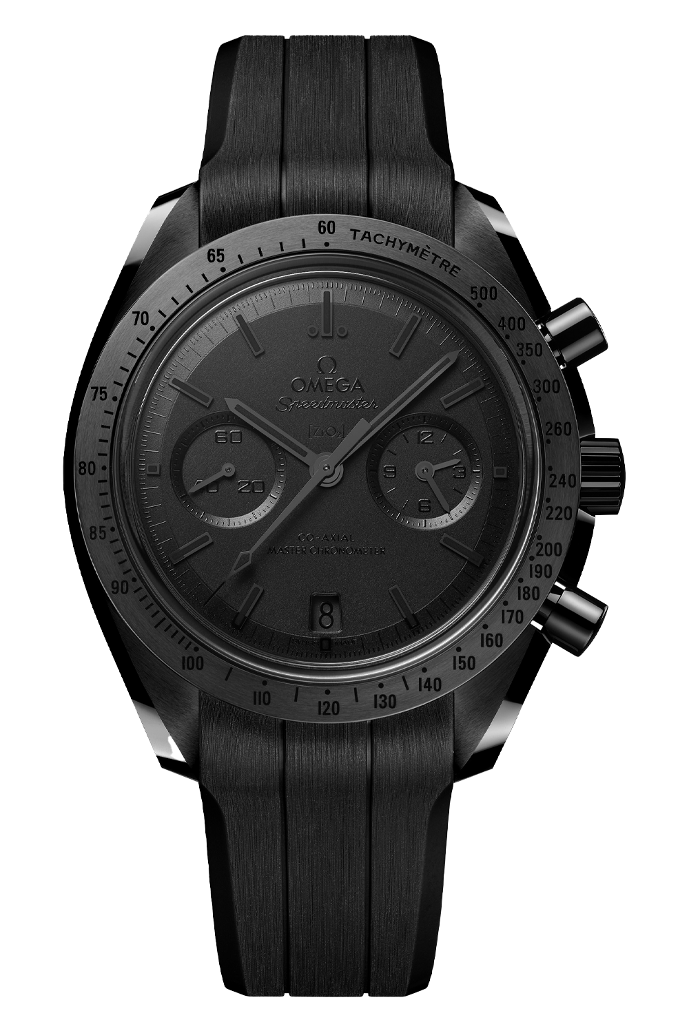 Visible through the caseback, OMEGA's self-winding Co-Axial Master Chronometer Calibre 9900 has been given a special “black edition” finish , which includes a matte-blackened rotor, main plate and bridges, as well as black varnished engravings. The watch is worn on a black rubber strap with a lunar surface pattern on the underside, a ceramic foldover clasp, and ceramised titanium frame-spring folders.