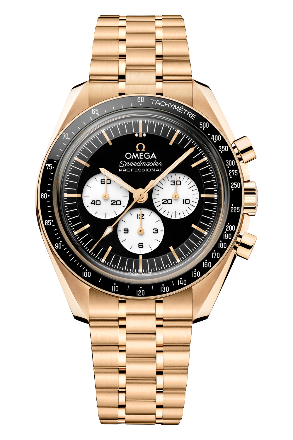 landings, the legendary chronograph is an impressive representation of the brand’s adventurous pioneering spirit.This 42 mm model in 18K Moonshine™ Gold features sapphire crystal glass on both the front and caseback, presented on a polished-brushed bracelet in the same precious metal. The design draws inspiration from the 4th generation Speedmaster worn on the moon. Its black varnished and lacquered double plate step dial is complemented by white varnished and lacquered subdials set within rhodium-plated frames. Details include the OMEGA logo, hands and indexes in 18K Moonshine™ Gold and the famous dot over 90 on the black ceramic bezel ring.