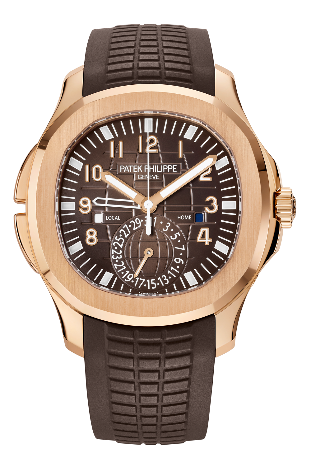 This rose gold watch houses a self-winding movement with a second time-zone display, combining excellent... legibility with user-friendliness. The date is indexed to local time. The brown dial and strap elegantly complement the shimmer of the rose gold case enhanced by polished and satin-brushed finishes.