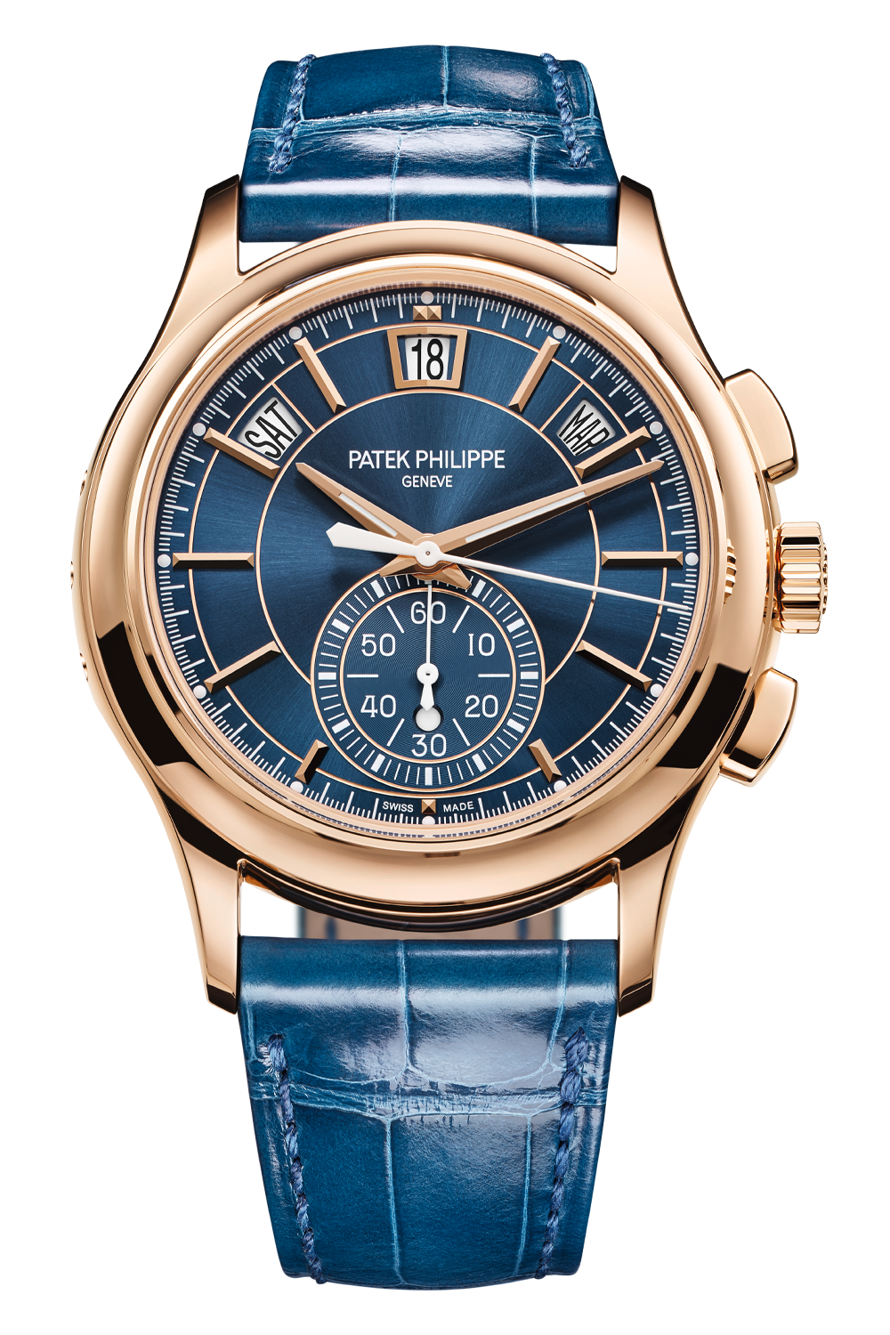 An alliance of two highly sought-after Patek Philippe complications, the self-winding flyback chronograph with... Annual Calendar Reference 5905 is offered in a rose gold version with a blue sunburst dial – a modern, elegant color that reinforces the timeless style of this flagship model. The Annual Calendar requires only one correction per year, at the end of February.