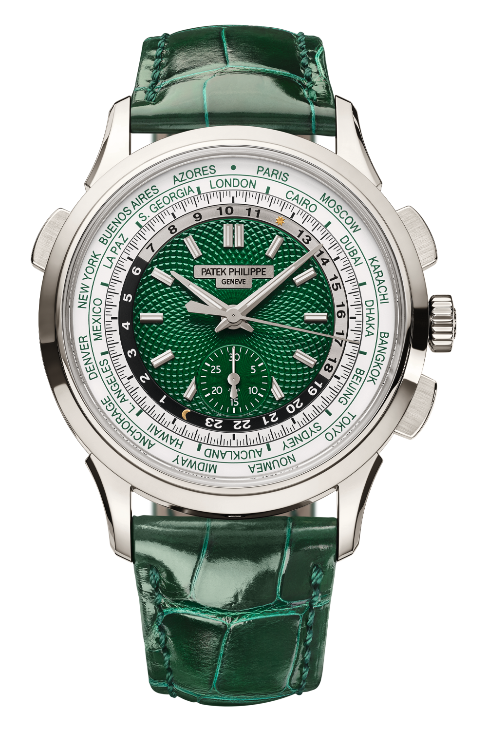 The self-winding flyback chronograph World Time Reference 5930 is offered in a brand-new version combining the... brilliance of platinum with a green dial and strap – a blend of classicism and boldness that reinforces the personality of this cult model. The dial exemplifies mastery of Rare Handcrafts’ techniques with a circular, hand-guilloched decoration.