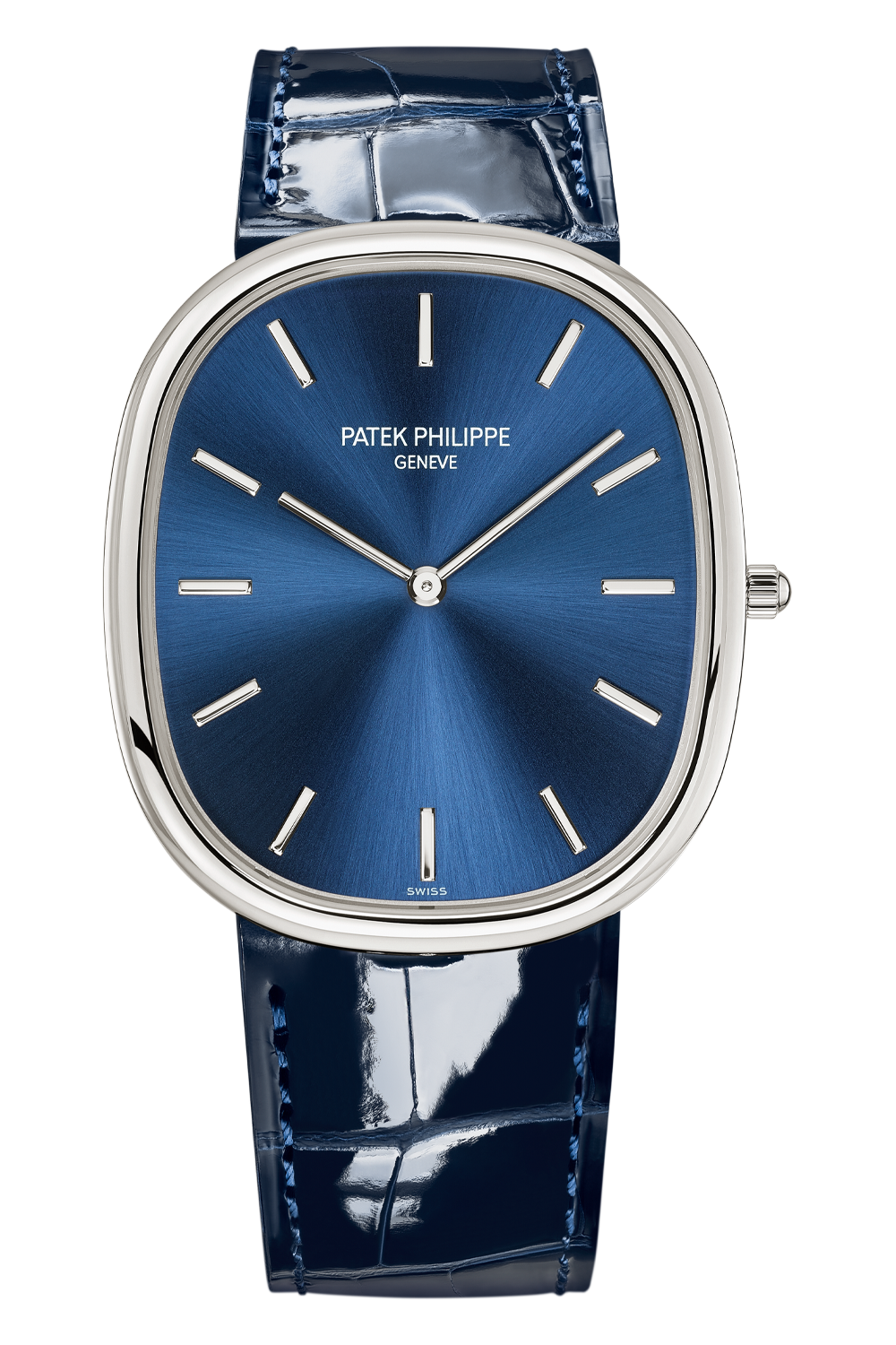 A larger version launched for the 40th anniversary of the legendary Golden Ellipse (2008), this timepiece combines... the brilliance of platinum with the elegance of a blue sunburst dial enhanced by applied gold hour-markers and slim gold hands. Featuring harmonious proportions inspired by the Golden Section, the case houses an ultra-thin self-winding movement.