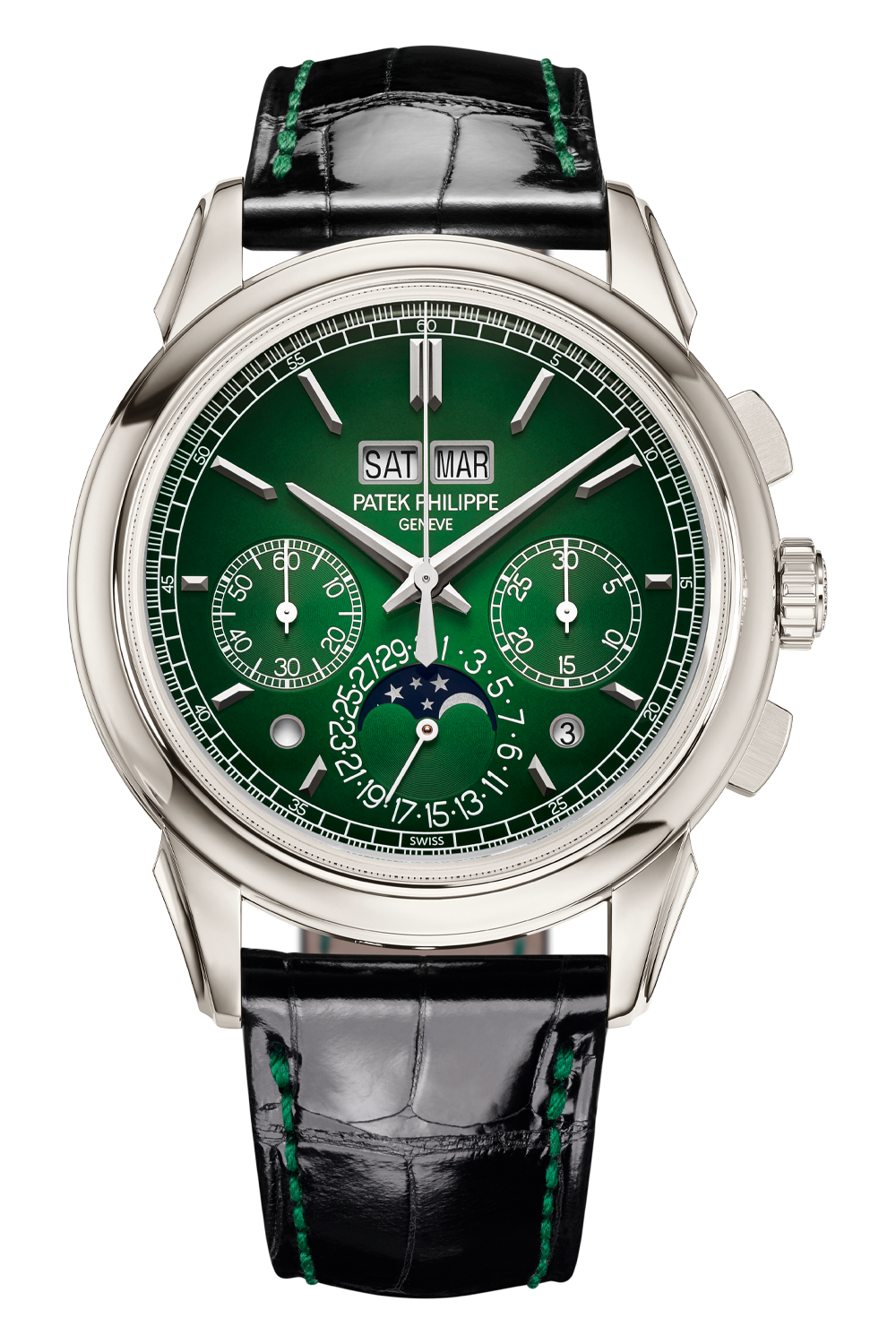 The gleam of platinum showcases the timeless design of this perpetual calendar chronograph with its concave bezel... and elegantly fluted lugs. The lacquered green dial evoking the bodywork of the finest automobiles presents its various displays in a particularly harmonious and legible layout.