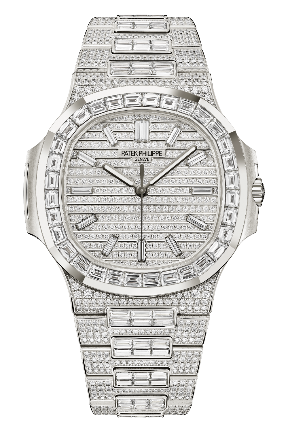 In creating this white gold Haute Joaillerie model, Patek Philippe has artfully played with the cut of the... baguette-cut and brilliant-cut diamonds to enhance the iconic design of the Nautilus case and bracelet. The self-winding movement with stop-seconds function enables time-setting to the exact second.
