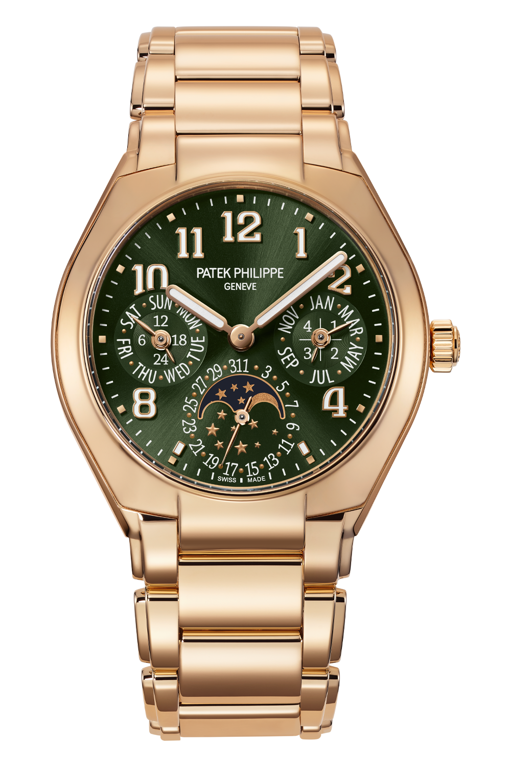 With its day/date/month displays by hands complemented by a moon-phase aperture, this self-winding Twenty~4... presents one of the most recognizable faces among Patek Philippe perpetual calendars. The rose gold case and bracelet are set off by a dial attired in an elegant sunburst olive green color that is both subtle and modern.