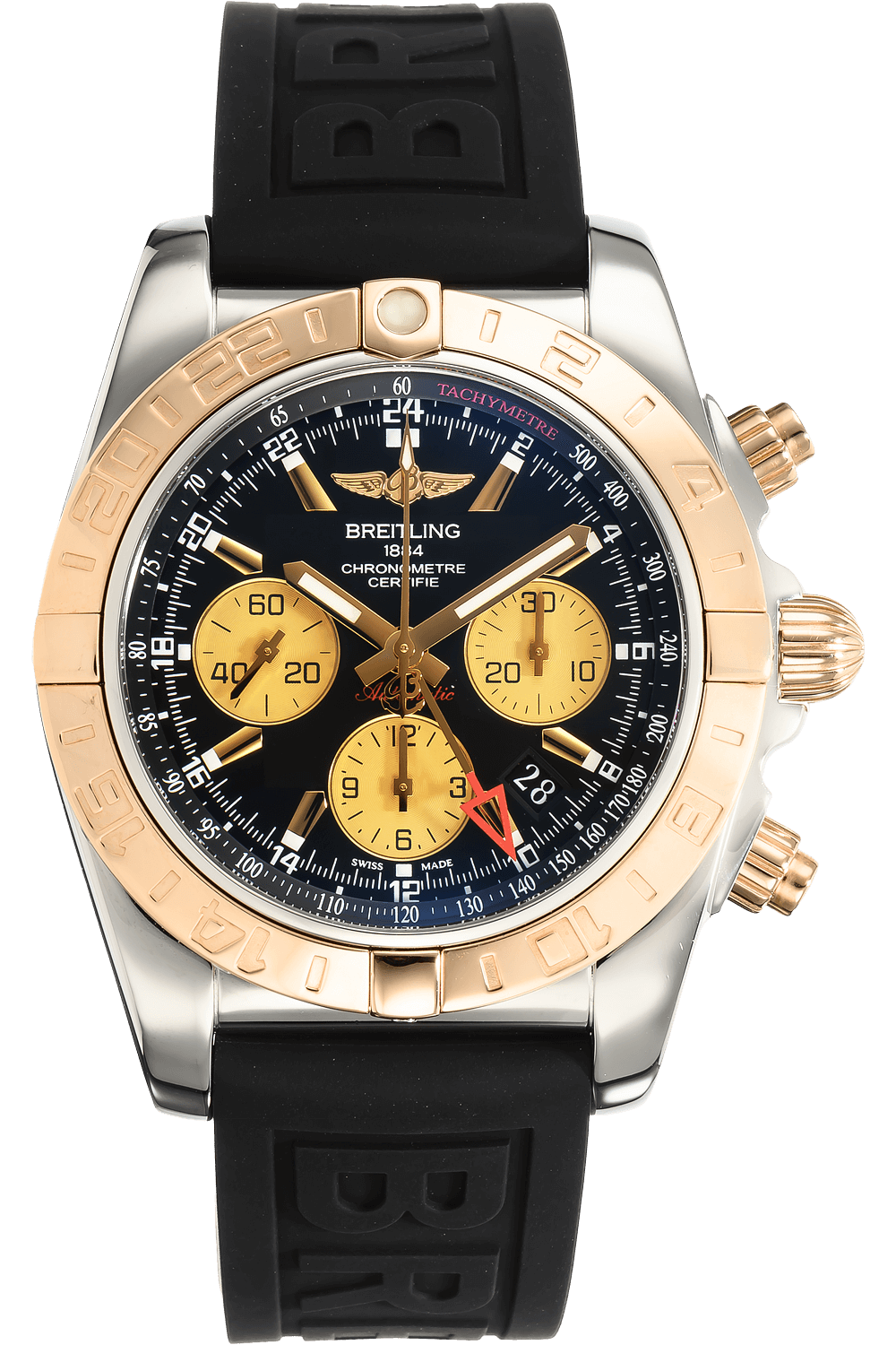 This pre-owned Chronomat GMT is crafted from rose gold and stainless steel with a black dial featuring stick markers.... Replete with a black rubber strap with deployant clasp, it is an exceptional choice for any collection.