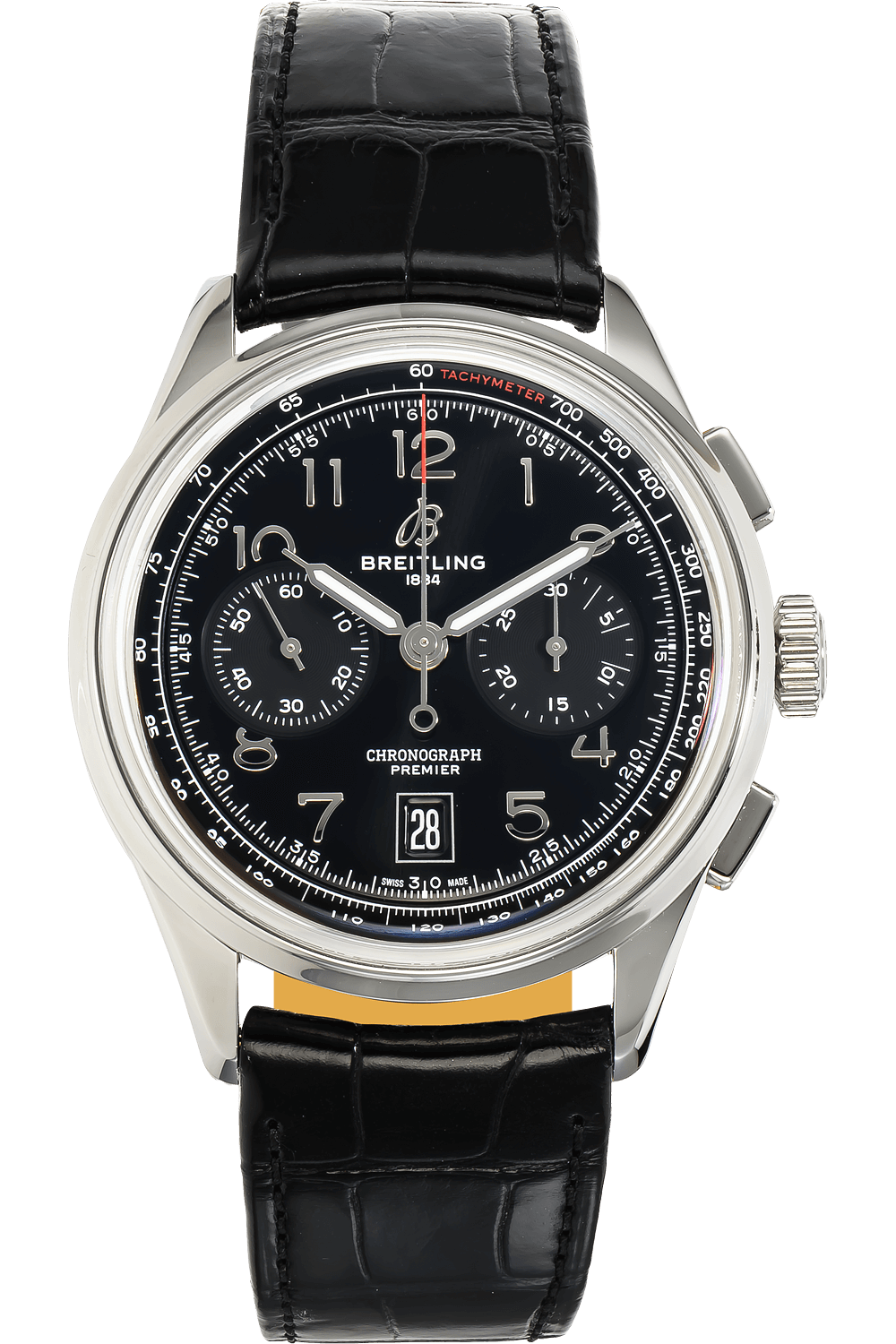 This pre-owned Premier B01 Chronograph is crafted from stainless steel with a black dial featuring arabic markers.... Replete with a black alligator strap with deployant clasp, it is an exceptional choice for any collection.