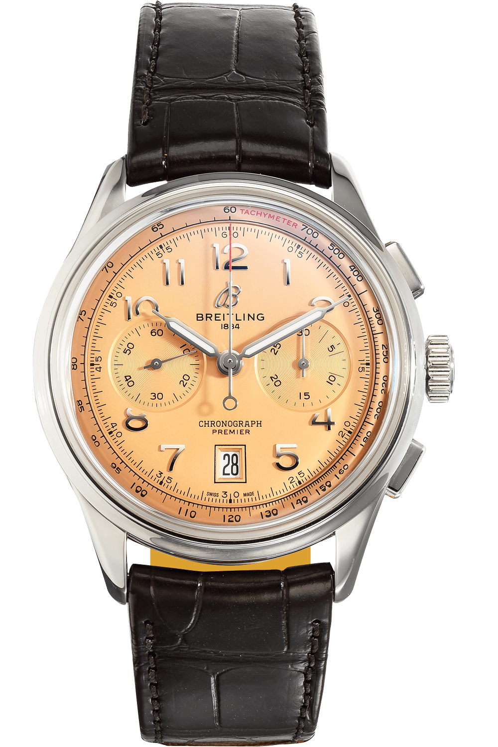 This pre-owned Premier B01 Chronograph is crafted from stainless steel with a orange dial featuring arabic markers.... Replete with a brown alligator strap with deployant clasp, it is an exceptional choice for any collection.