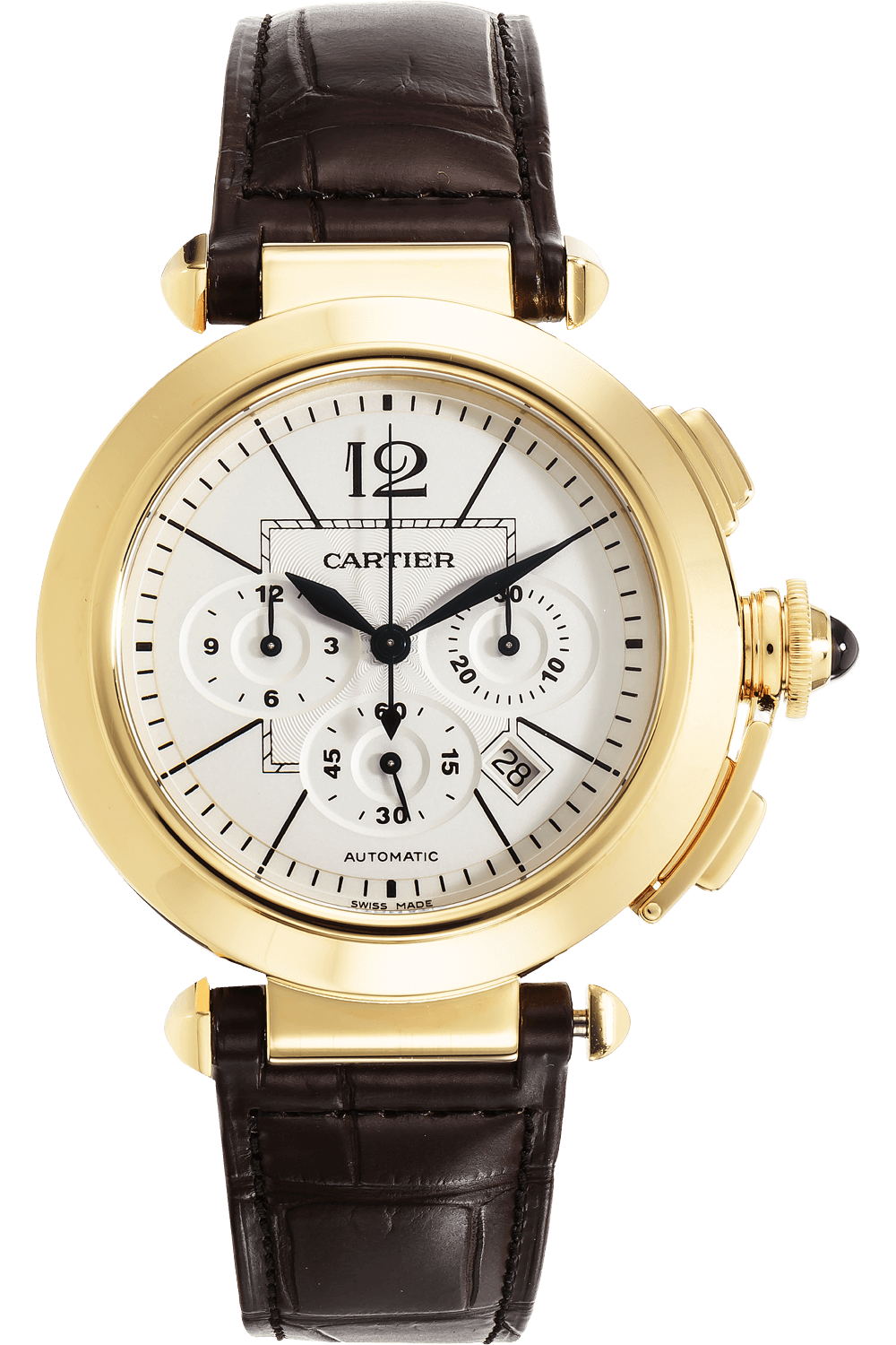 This pre-owned Pasha Chronograph is crafted from yellow gold with a silver dial featuring stick markers. Replete... with a brown alligator strap with deployant clasp, it is an exceptional choice for any collection.