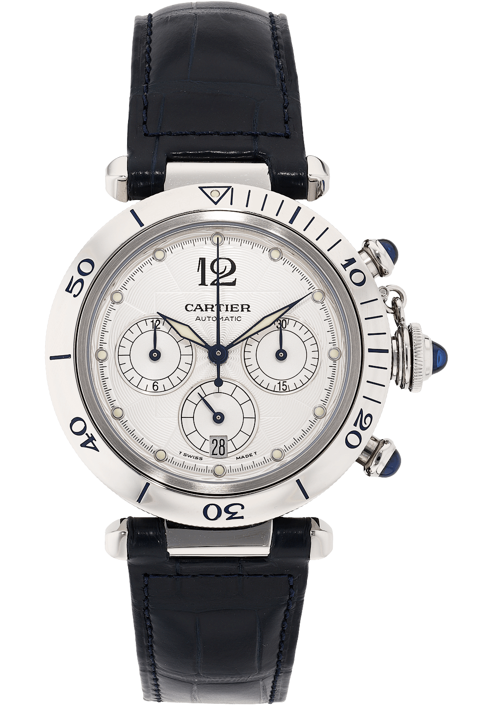This pre-owned Pasha Diver Chronograph is crafted from stainless steel with a silver dial featuring dot markers.... Replete with a blue alligator strap with deployant clasp, it is an exceptional choice for any collection.