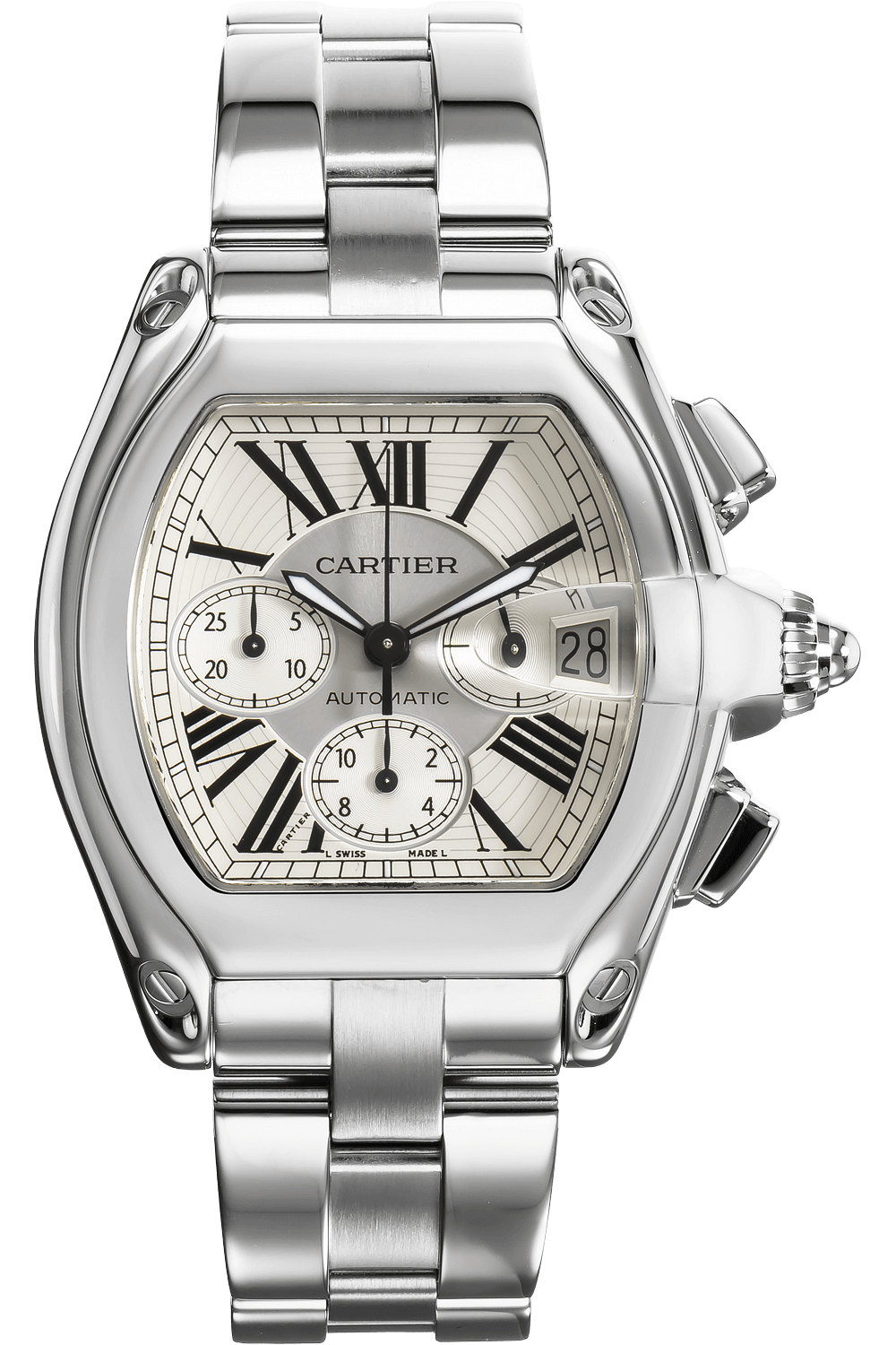 A watch of ambitious modernity, the Cartier Roadster was inspired by the Porsche Roadster and features design... elements such as a date window resembling a car windshield, lugs crafted to look like design headlights and a distinctive crown reminiscent of vintage wheels.