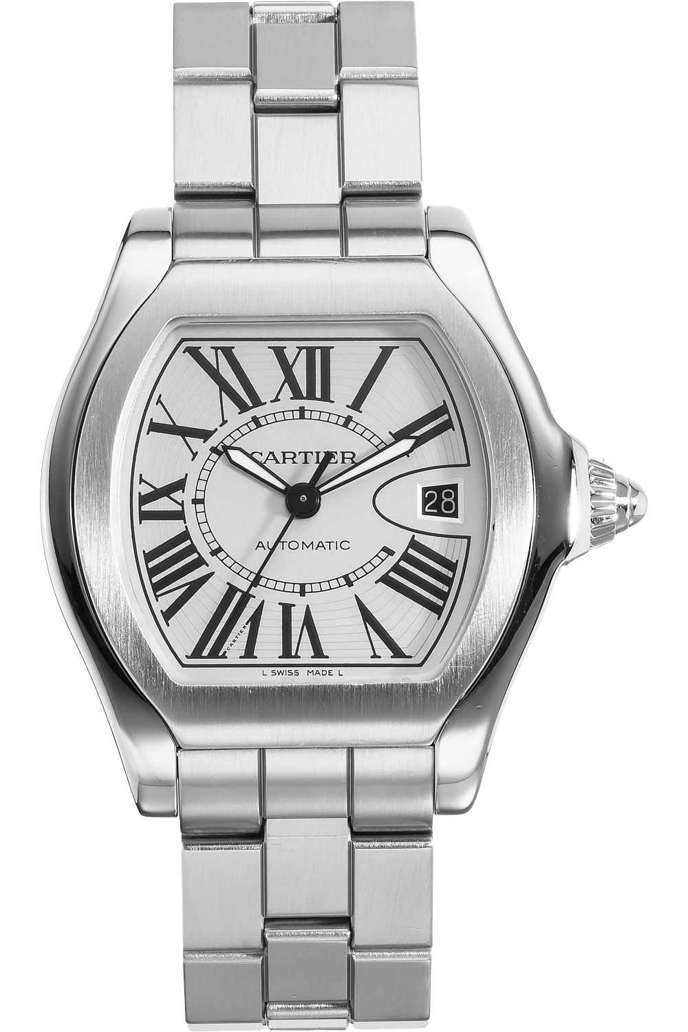 A watch of ambitious modernity, the Cartier Roadster was inspired by the Porsche Roadster and features design elements such as a date window resembling a car windshield, lugs crafted to look like design headlights and a distinctive crown reminiscent of vintage wheels.