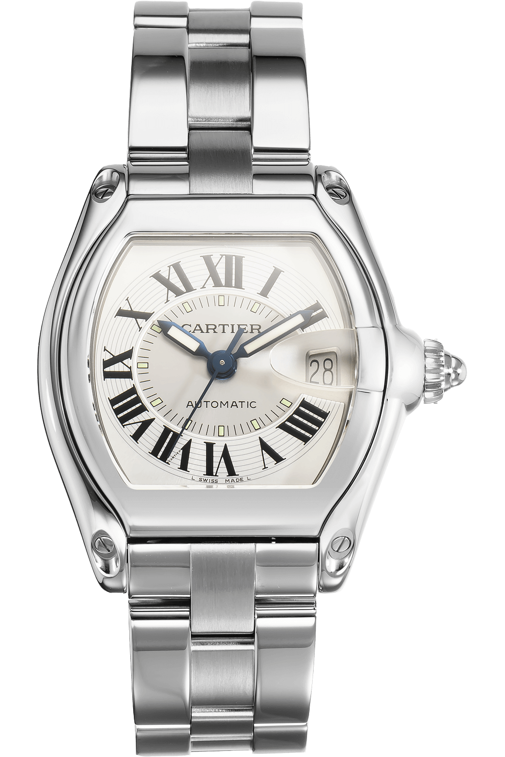 A watch of ambitious modernity, the Cartier Roadster was inspired by the Porsche Roadster and features design... elements such as a date window resembling a car windshield, lugs crafted to look like design headlights and a distinctive crown reminiscent of vintage wheels.