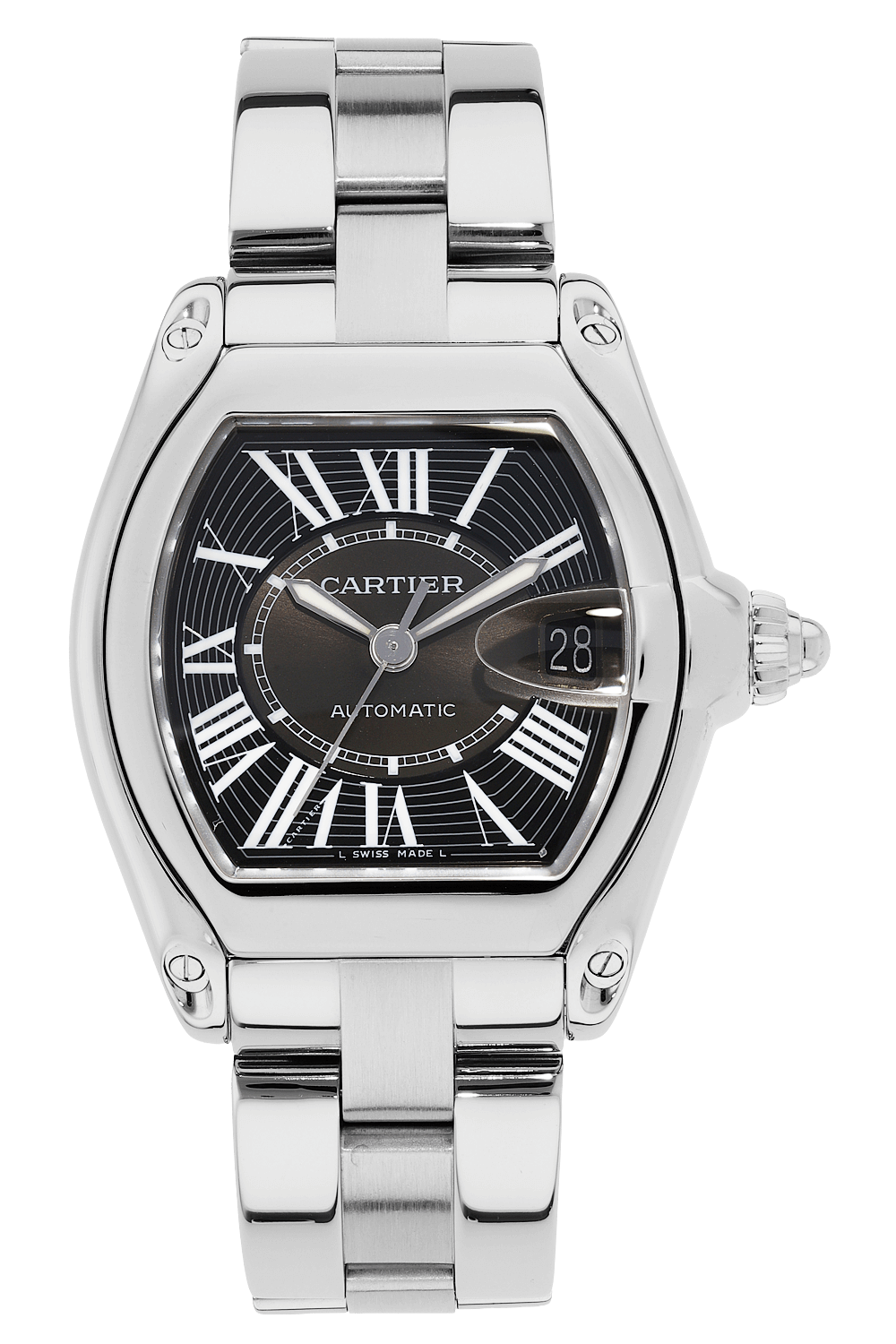 A watch of ambitious modernity, the Cartier Roadster was inspired by the Porsche Roadster and features design elements such as a date window resembling a car windshield, lugs crafted to look like design headlights and a distinctive crown reminiscent of vintage wheels.