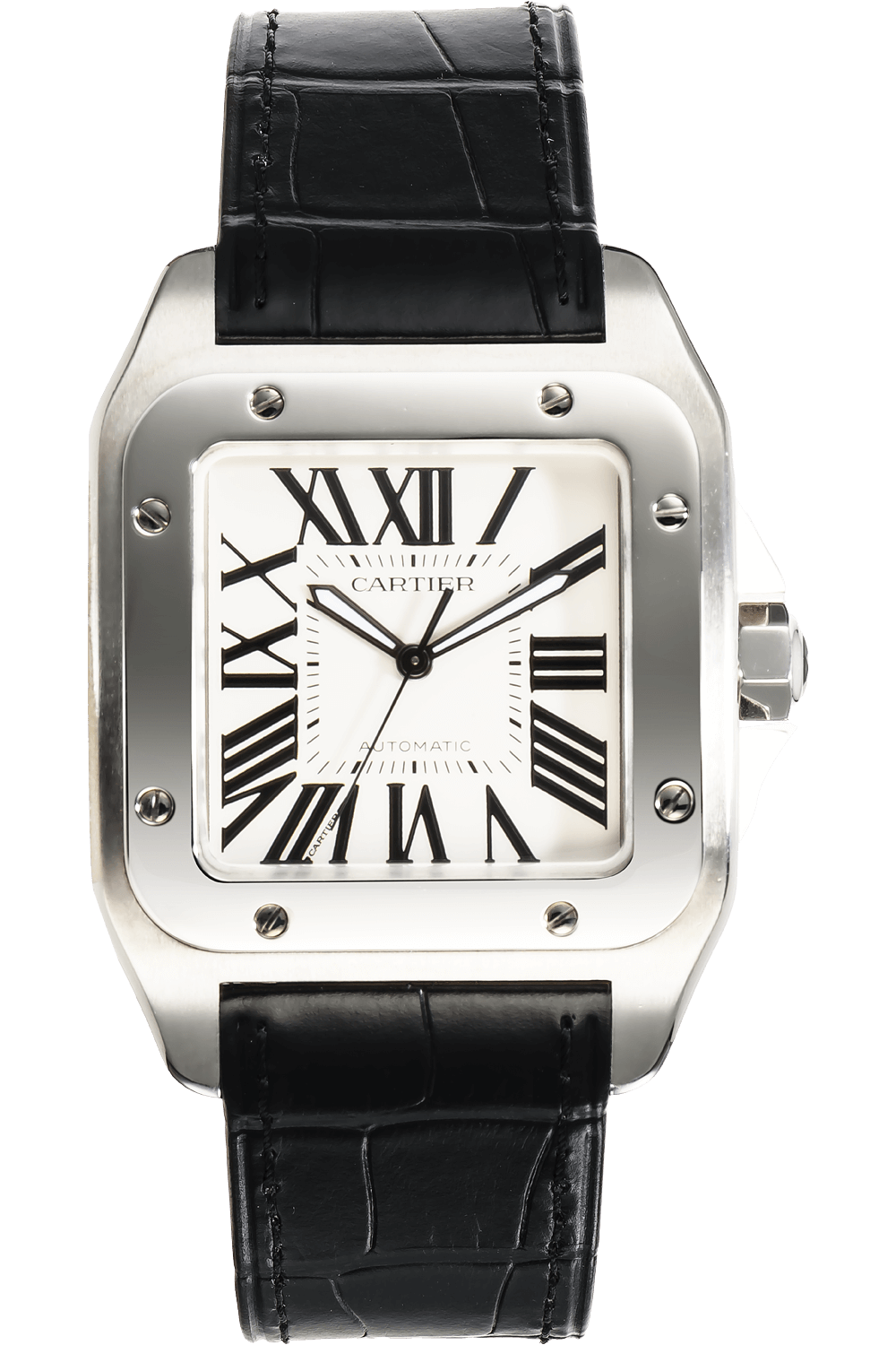This pre-owned Santos 100 is crafted from stainless steel with a silver dial featuring roman markers. Replete with a... black alligator strap with deployant clasp, it is an exceptional choice for any collection.
