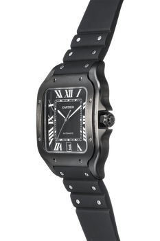 This pre-owned Santos de Cartier is crafted from dlc stainless steel with a black dial featuring roman markers.... Replete with a black rubber strap with deployant clasp, it is an exceptional choice for any collection.