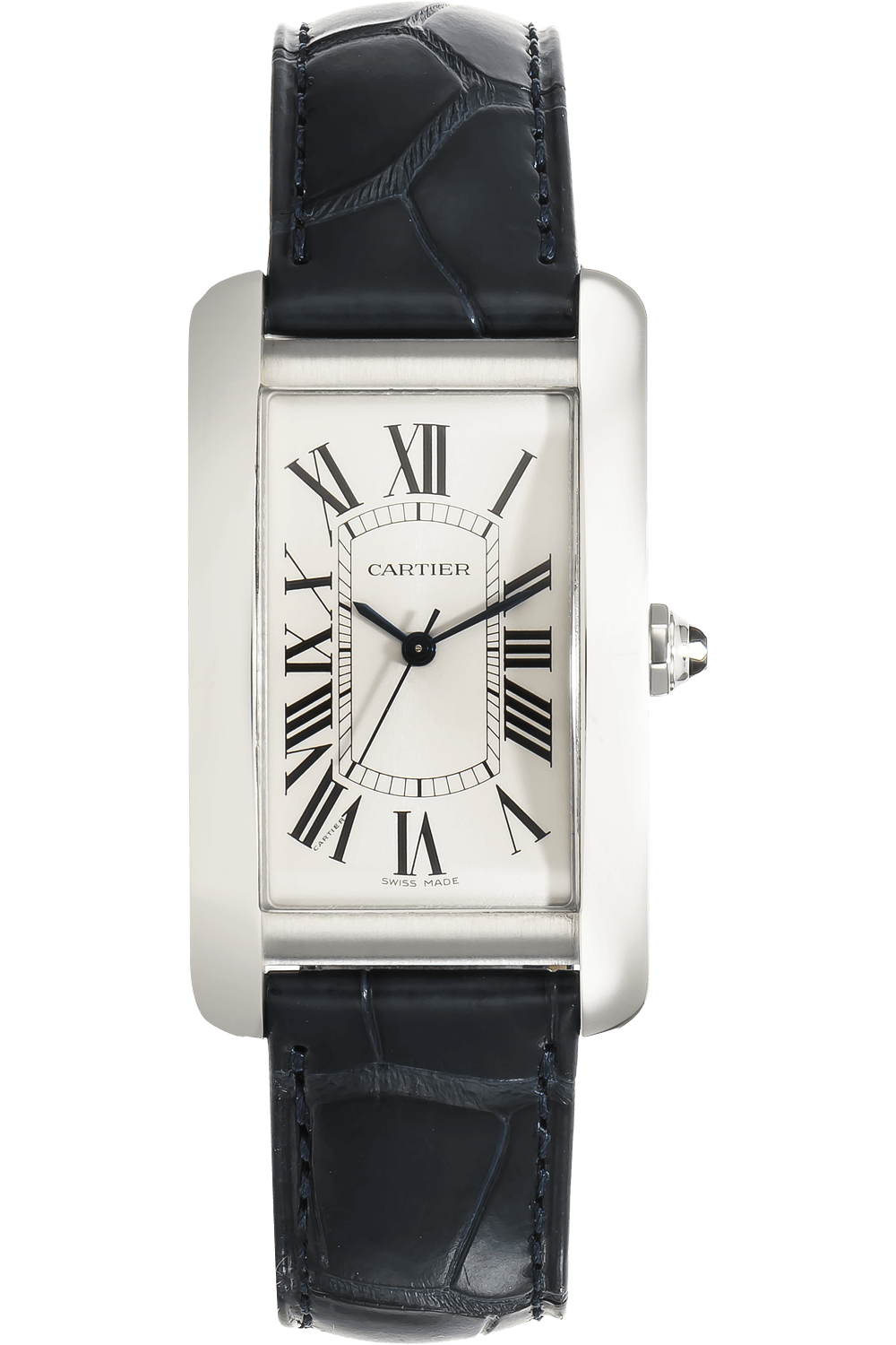 This pre-owned Tank Americaine is crafted from stainless steel with a silver dial featuring roman markers. Replete... with a blue alligator strap with deployant clasp, it is an exceptional choice for any collection.