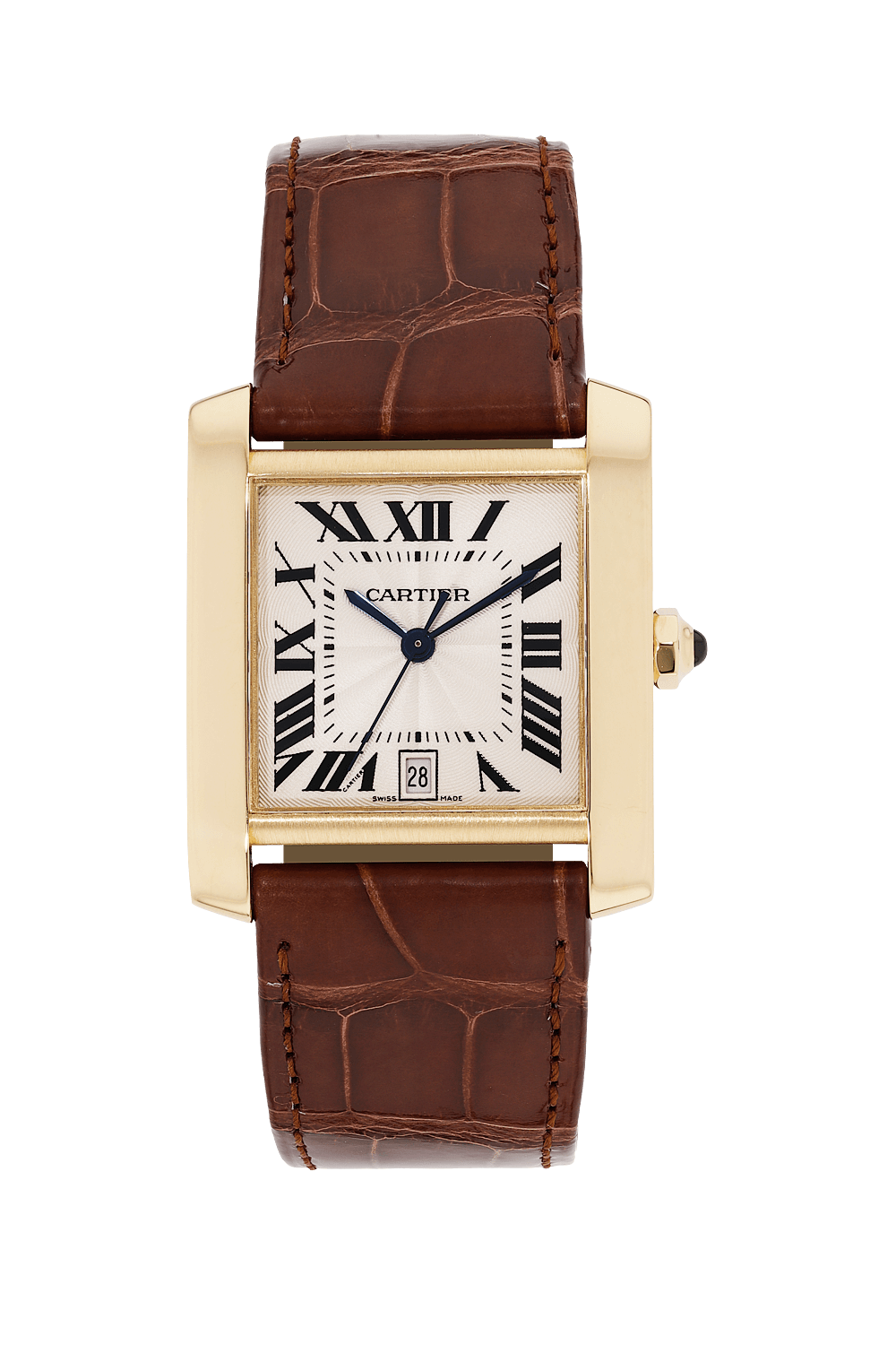 This pre-owned Tank Francaise is crafted from yellow gold with a silver dial featuring roman markers. Replete with a... brown alligator strap with tang buckle, it is an exceptional choice for any collection.