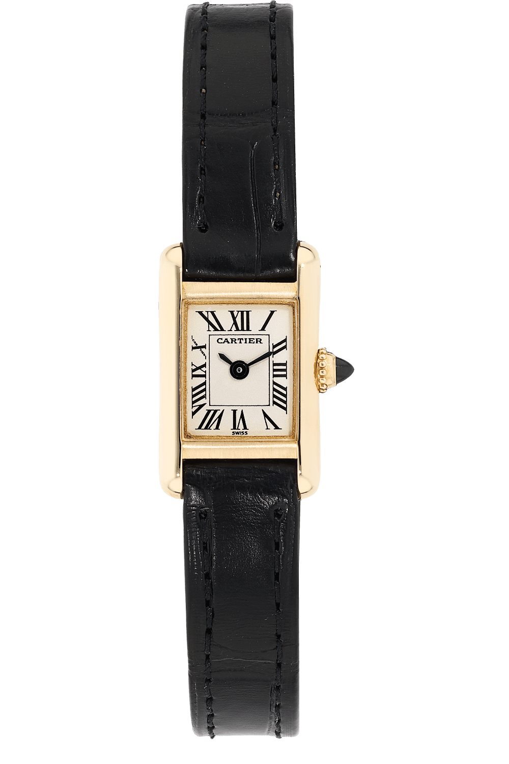 This pre-owned Tank Mini is crafted from yellow gold with a white dial featuring roman markers. Replete with a black... alligator strap with tang buckle, it is an exceptional choice for any collection.