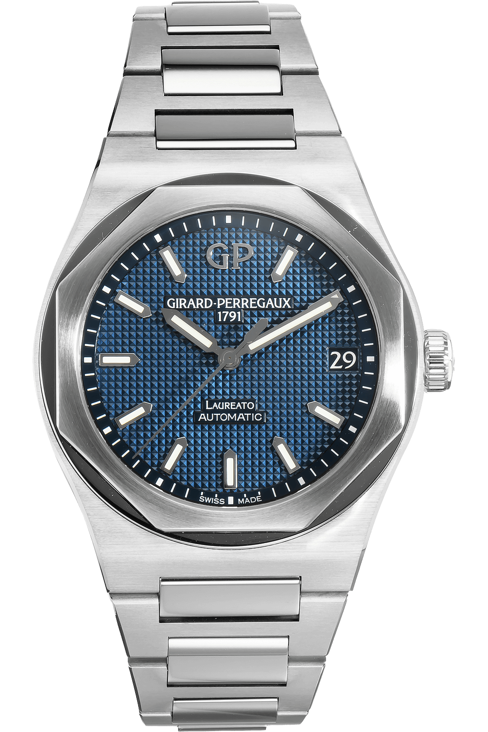 This pre-owned Laureato is crafted from stainless steel with a blue dial featuring stick markers. Replete with a... stainless steel bracelet, it is an exceptional choice for any collection.