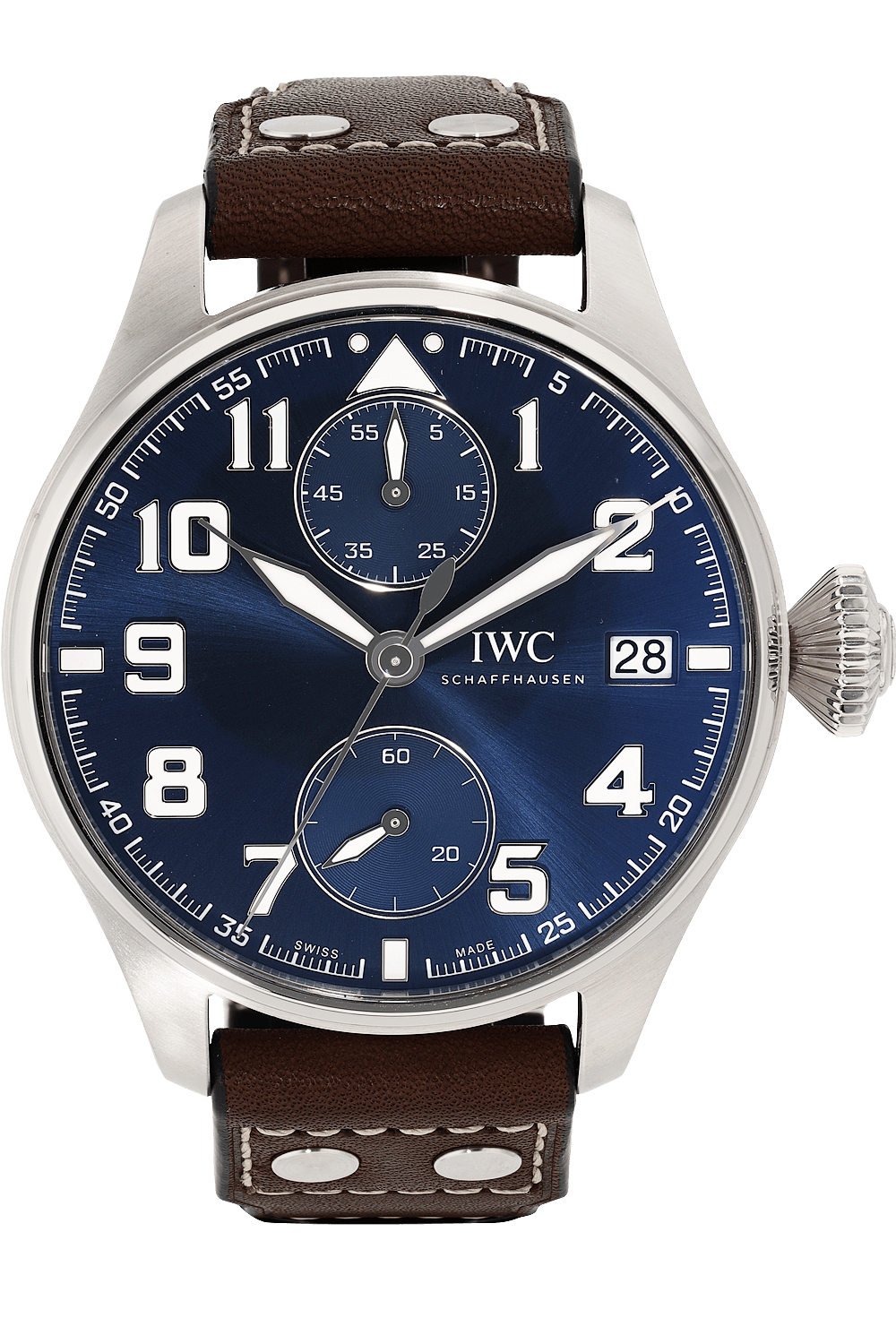 This pre-owned Big Pilot's Watch Monopusher Edition "Le Petit Prince" is crafted from stainless steel with a blue... dial featuring arabic markers. Replete with a brown leather strap with deployant clasp, it is an exceptional choice for any collection.
