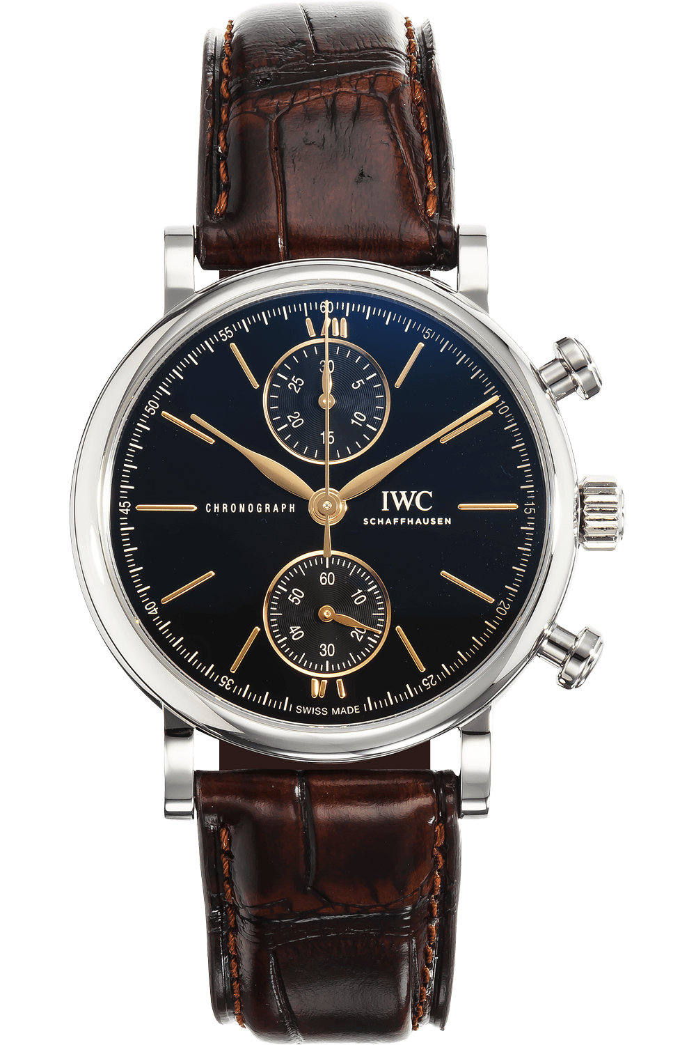 This pre-owned Portofino Chronograph is crafted from stainless steel with a black dial featuring stick markers.... Replete with a brown alligator strap with tang buckle, it is an exceptional choice for any collection.