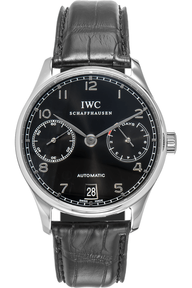 This pre-owned Portuguese is crafted from stainless steel with a black dial featuring arabic markers. Replete with a... black alligator strap with deployant clasp, it is an exceptional choice for any collection.