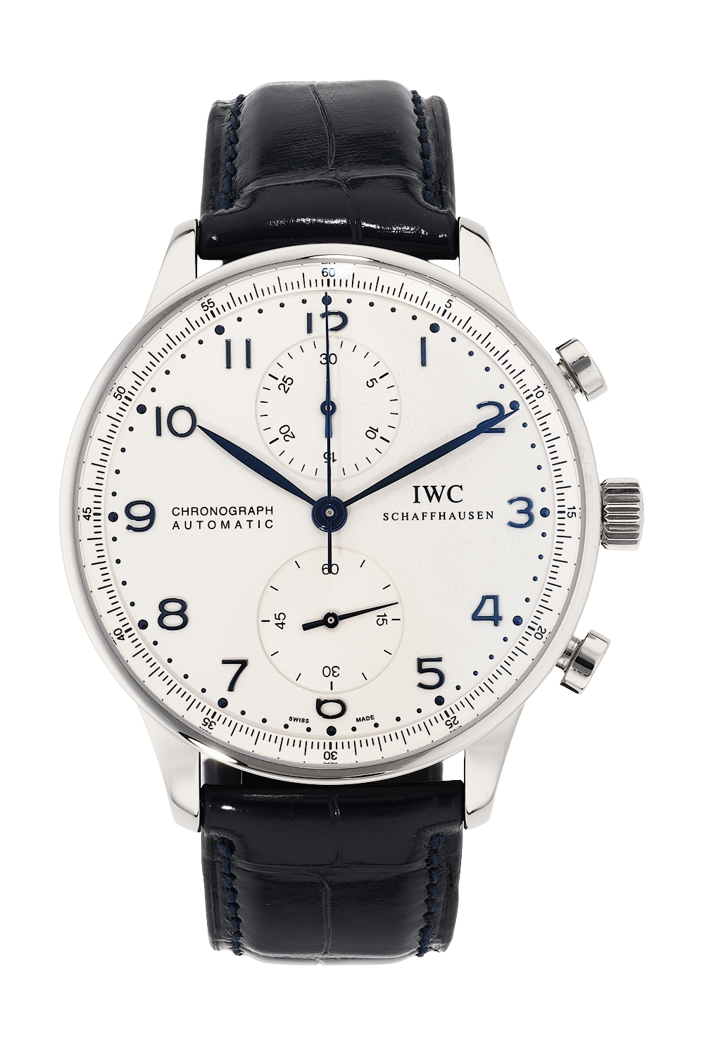 This pre-owned Portuguesier Chronograph is crafted from stainless steel with a silver dial featuring arabic... markers. Replete with a blue alligator strap with deployant clasp, it is an exceptional choice for any collection.