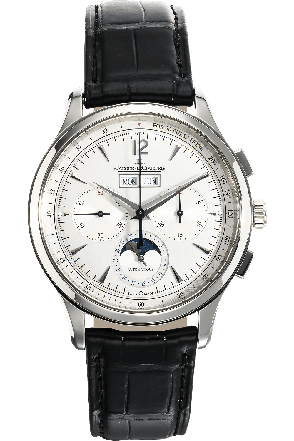 This pre-owned Master Control Chronograph Calendar is crafted from stainless steel with a silver dial featuring... stick markers. Replete with a black alligator strap with deployant clasp, it is an exceptional choice for any collection.