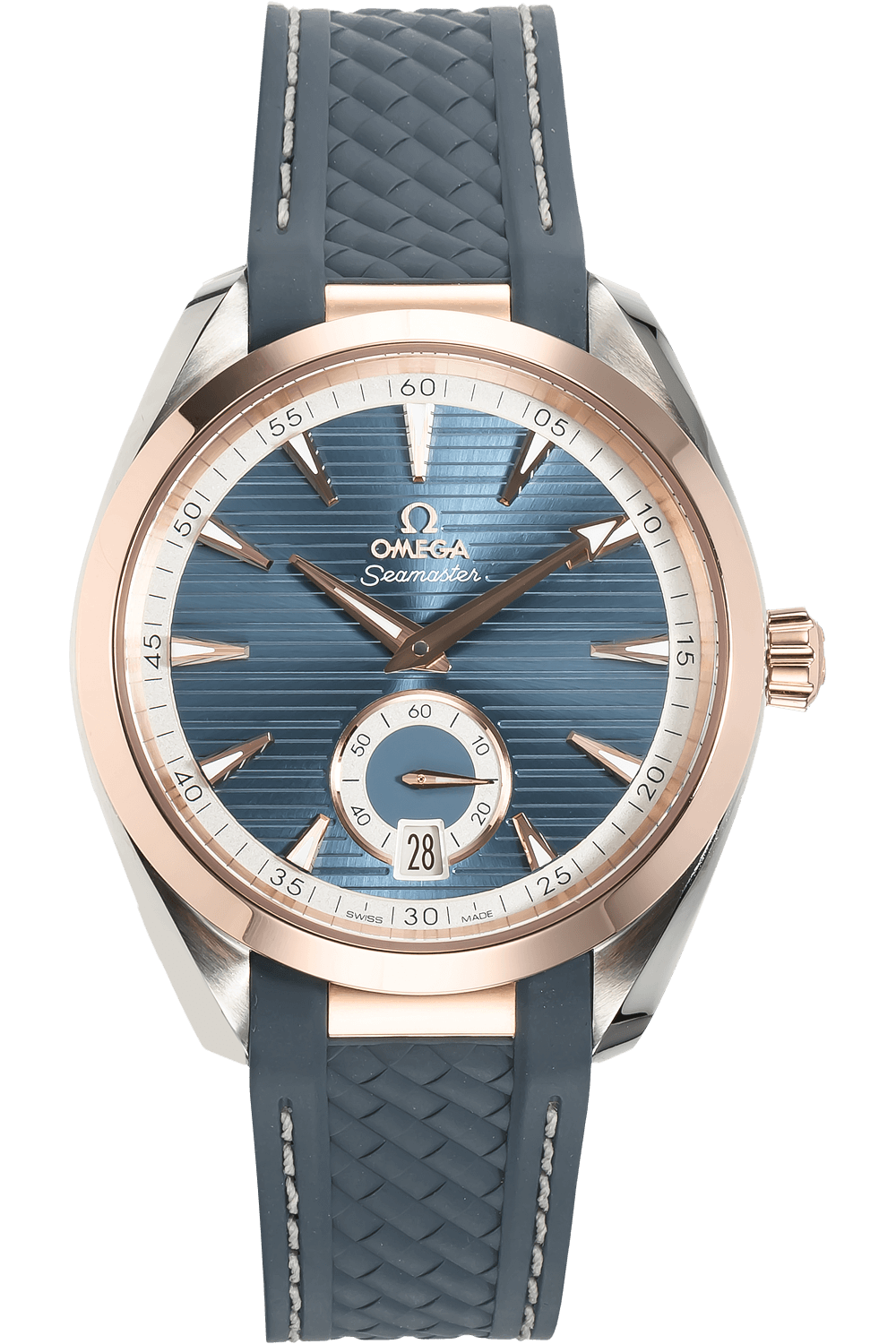 This pre-owned Seamaster Aqua Terra Co-Axial is crafted from rose gold and stainless steel with a blue dial featuring... stick markers. Replete with a blue rubber strap with deployant clasp, it is an exceptional choice for any collection.