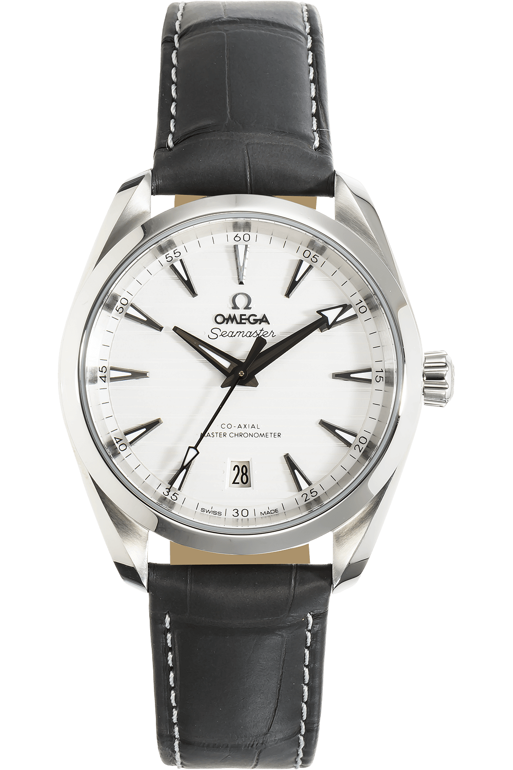 This pre-owned Seamaster Aqua Terra Co-Axial is crafted from stainless steel with a silver dial featuring stick... markers. Replete with a gray alligator strap with deployant clasp, it is an exceptional choice for any collection.