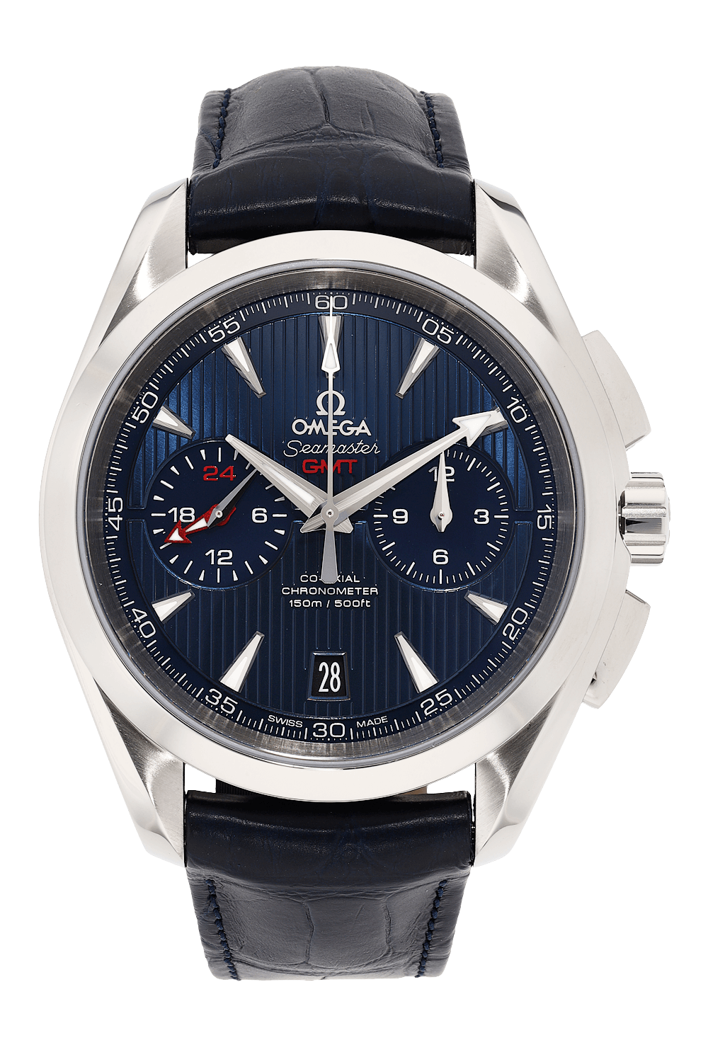 This pre-owned Seamaster Aqua Terra GMT Chronograph is crafted from stainless steel with a blue dial featuring stick... markers. Replete with a blue alligator strap with deployant clasp, it is an exceptional choice for any collection.