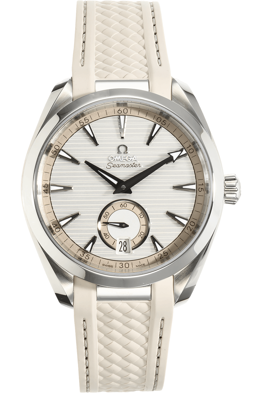This pre-owned Seamaster Aqua Terra is crafted from stainless steel with a silver dial featuring stick markers.... Replete with a beige rubber strap with deployant clasp, it is an exceptional choice for any collection.
