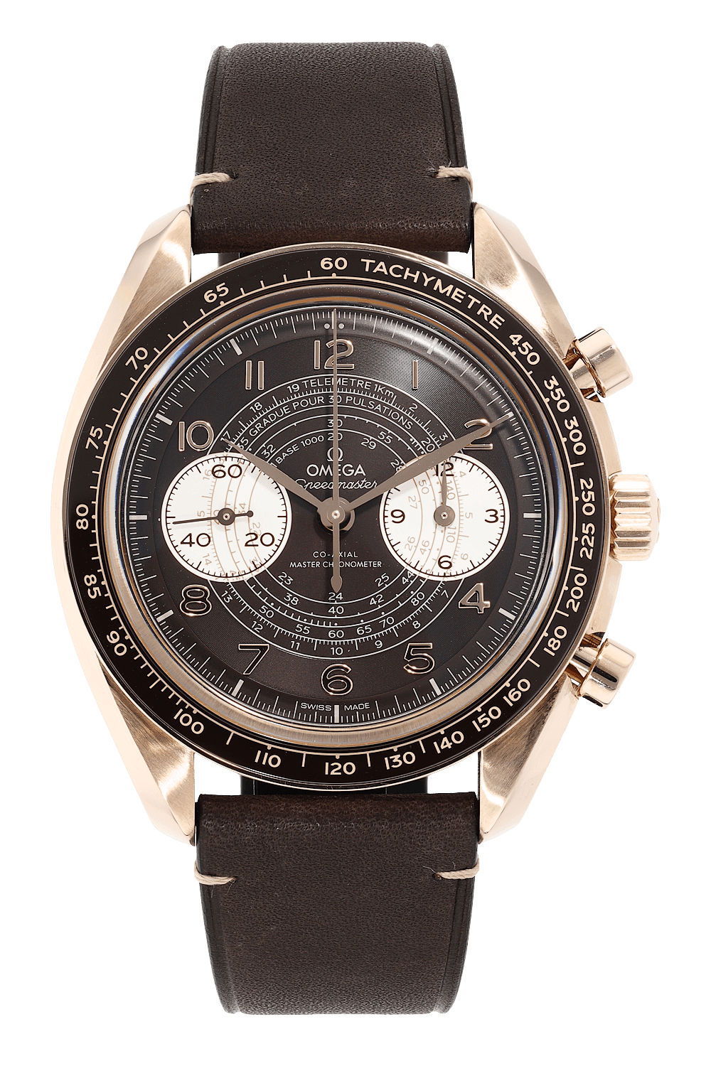 This pre-owned Speedmaster Chronoscope is crafted from rose gold with a brown dial featuring arabic markers.... Replete with a brown leather strap with tang buckle, it is an exceptional choice for any collection.