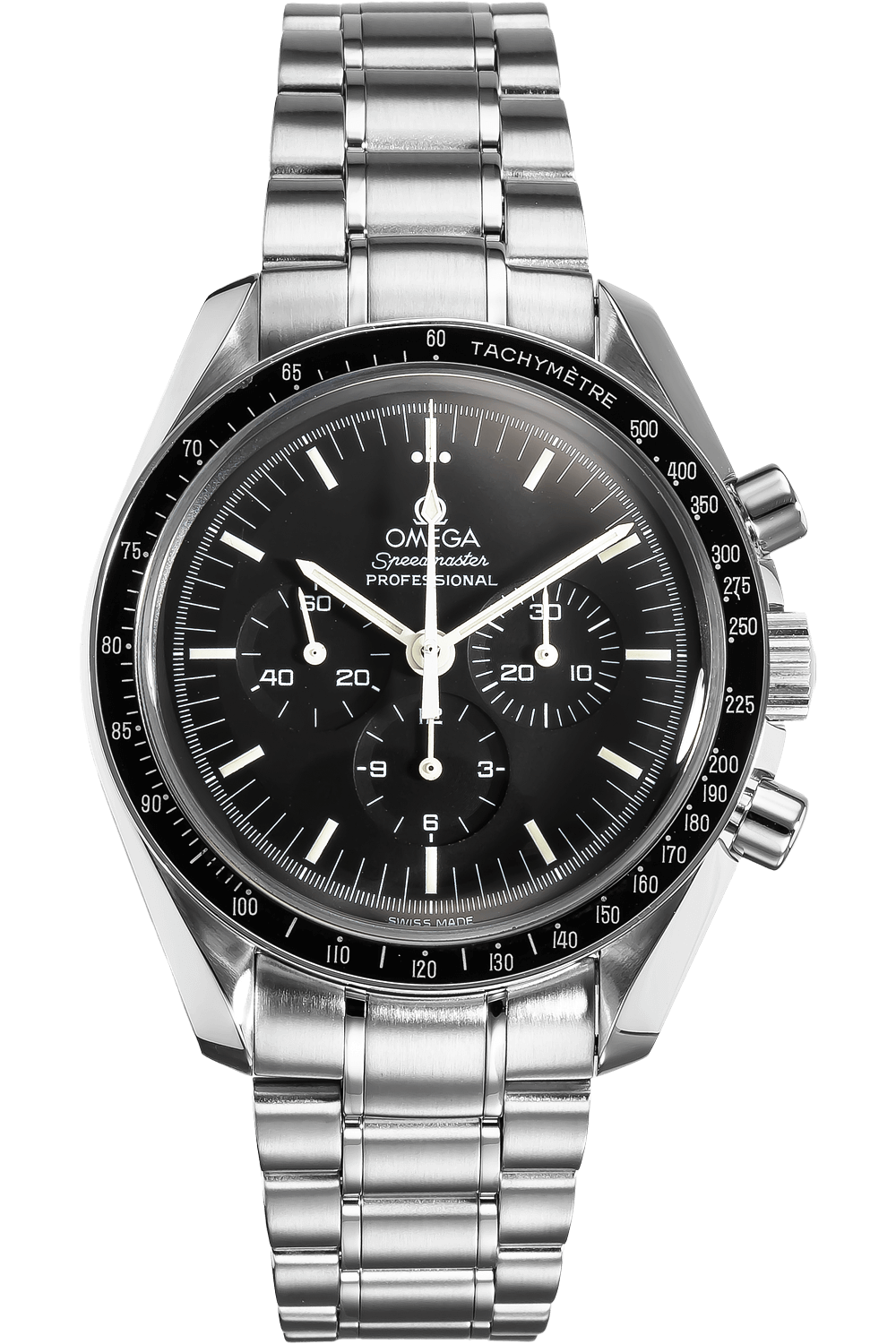 This pre-owned Speedmaster Moonwatch Professional is crafted from stainless steel with a black dial featuring... stick markers. Replete with a stainless steel bracelet, it is an exceptional choice for any collection.