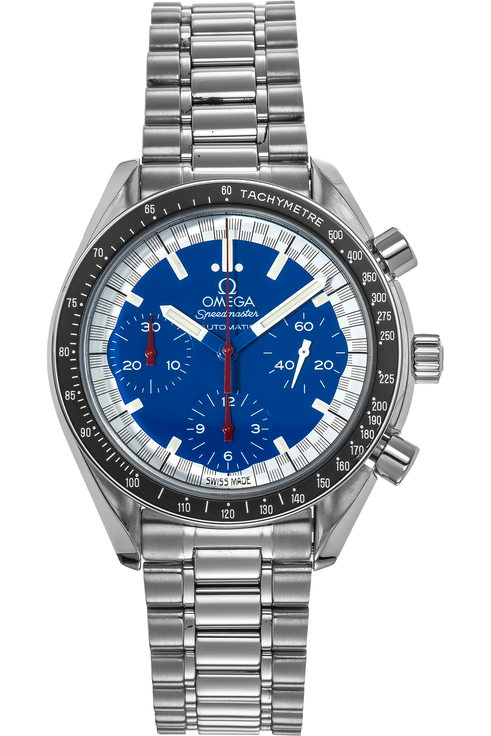 This pre-owned Speedmaster Reduced Michael Schumacher Cart Edition is crafted from stainless steel with a blue dial... featuring stick markers. Replete with a stainless steel bracelet, it is an exceptional choice for any collection.