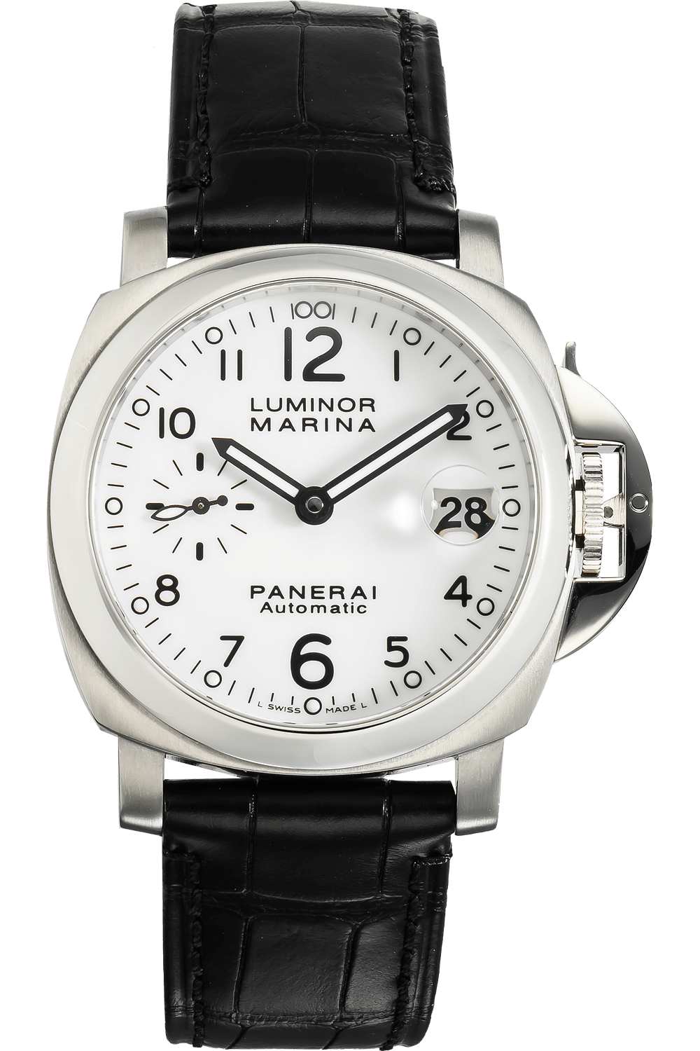 This pre-owned Luminor Marina is crafted from stainless steel with a white dial featuring arabic markers. Replete... with a black alligator strap with deployant clasp, it is an exceptional choice for any collection.
