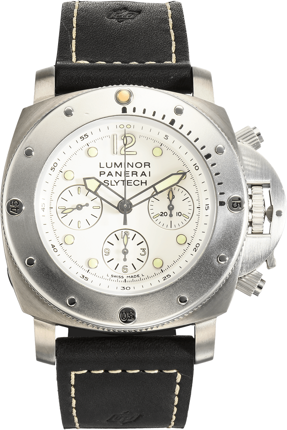 This pre-owned Luminor Submersible Slytech Special Edition is crafted from titanium with a white dial featuring dot... markers. Replete with a black leather strap with tang buckle, it is an exceptional choice for any collection.