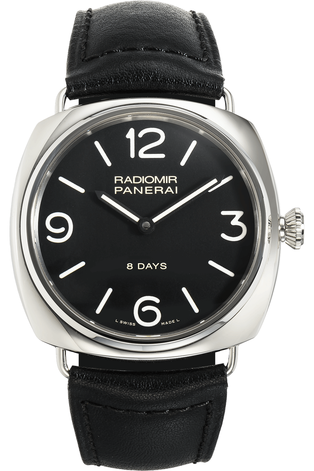 The Radiomir was the first watch created by Panerai and has since become an icon among timepieces. Its design... hallmarks include a large, cushion-shaped case, wire lugs and a luminescent dial with unparalleled legibility.