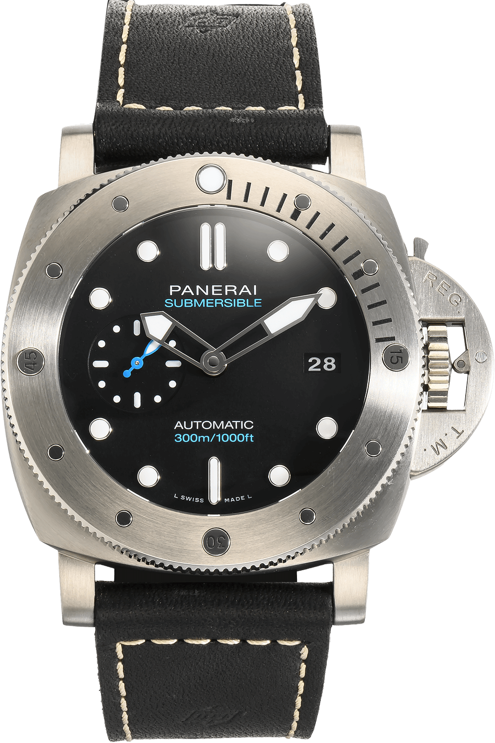 A survival instrument, the Panerai Submersible is an excellent diver's watch. It features an iconic, patented device to protect the winding crown, which gives the timepiece a strong and decisive aesthetic.