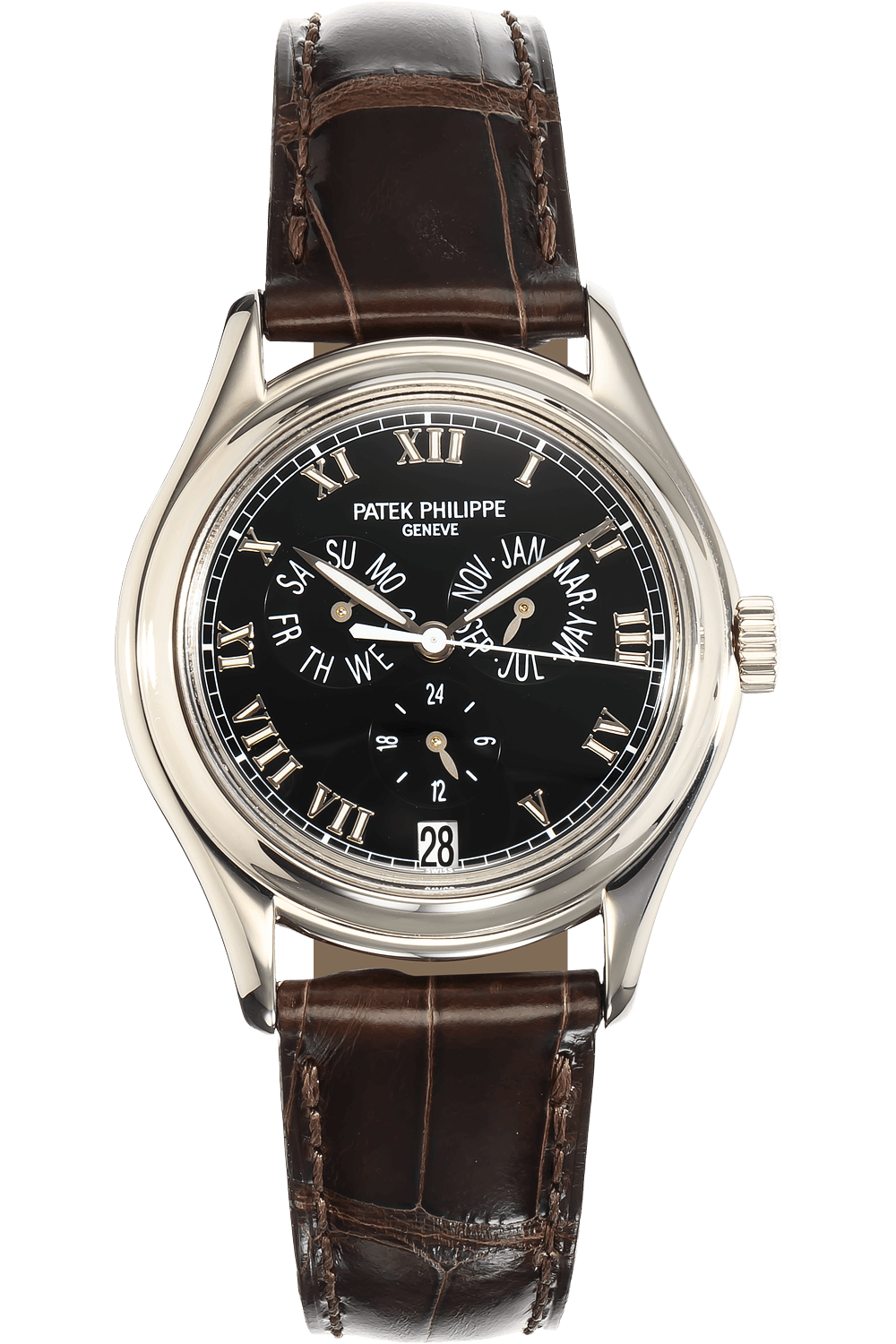 This pre-owned Annual Calendar Reference 5035 is crafted from white gold with a black dial featuring roman markers.... Replete with a brown alligator strap with tang buckle, it is an exceptional choice for any collection.