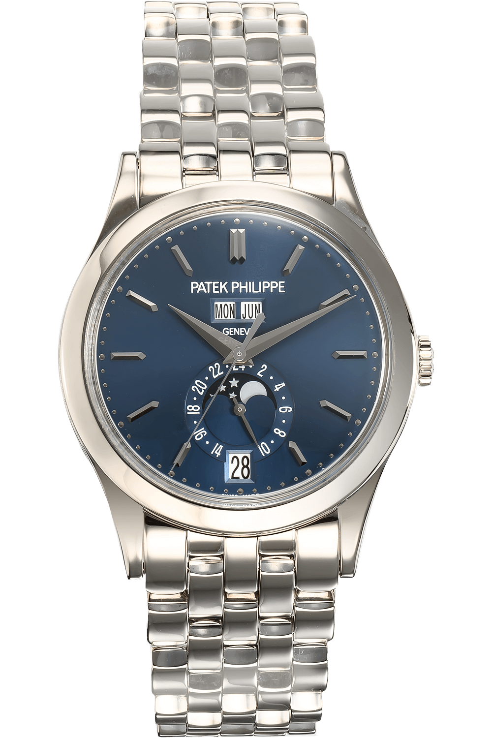 This pre-owned Annual Calendar Reference 5396 is crafted from white gold with a blue dial featuring stick markers.... Replete with a white gold bracelet, it is an exceptional choice for any collection.