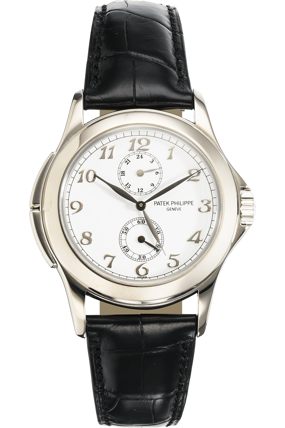 This pre-owned Calatrava Travel Time Reference 5134 is crafted from white gold with a white dial featuring arabic... markers. Replete with a black alligator strap with deployant clasp, it is an exceptional choice for any collection.