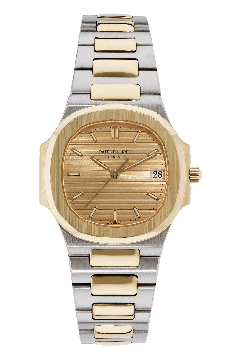 This pre-owned Nautilus is crafted from yellow gold and stainless steel with a champagne dial featuring stick... markers. Replete with a steel and yellow gold bracelet, it is an exceptional choice for any collection.