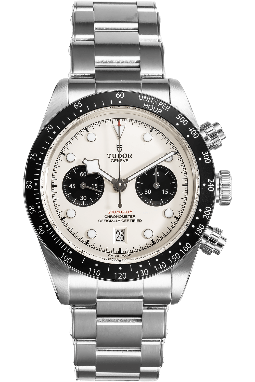This pre-owned Black Bay Chrono is crafted from stainless steel with a white dial featuring dot markers. Replete with... a stainless steel bracelet, it is an exceptional choice for any collection.