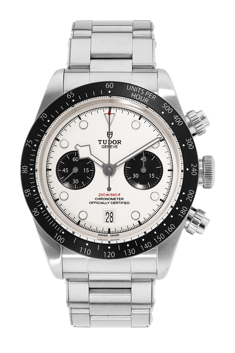 This pre-owned Black Bay Chrono is crafted from stainless steel with a white dial featuring dot markers. Replete with... a stainless steel bracelet, it is an exceptional choice for any collection.