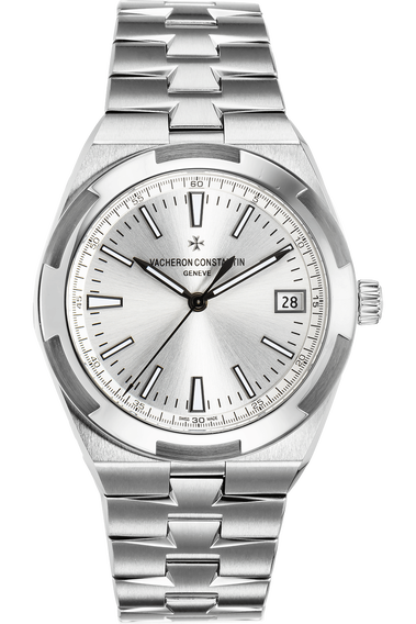 This pre-owned Overseas is crafted from stainless steel with a silver dial featuring stick markers. Replete with a... stainless steel bracelet, it is an exceptional choice for any collection.
