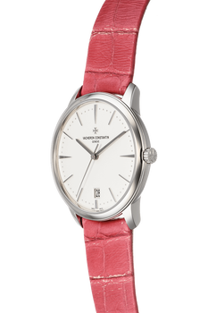 This pre-owned Patrimony is crafted from white gold with a white dial featuring stick markers. Replete with a pink... alligator strap with tang buckle, it is an exceptional choice for any collection.