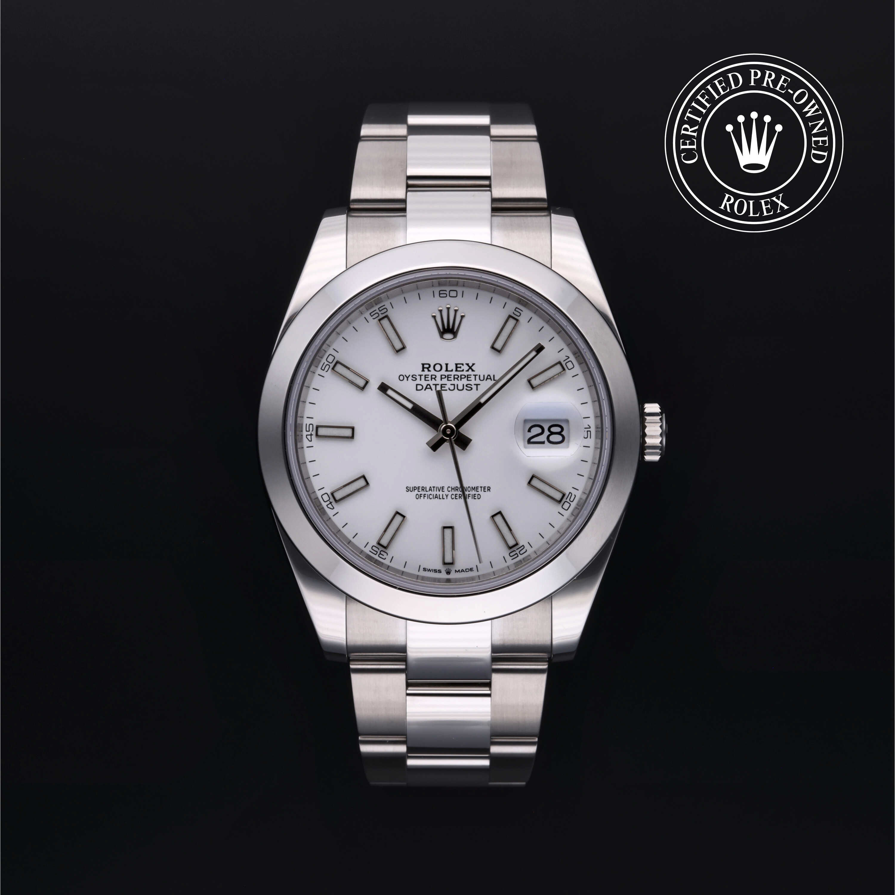 This Rolex Certified Pre-Owned Datejust features a 41 mm case of stainless steel and a white dial. The date function and automatic movement are exceptional representations of Rolex's impeccable craftsmanship.