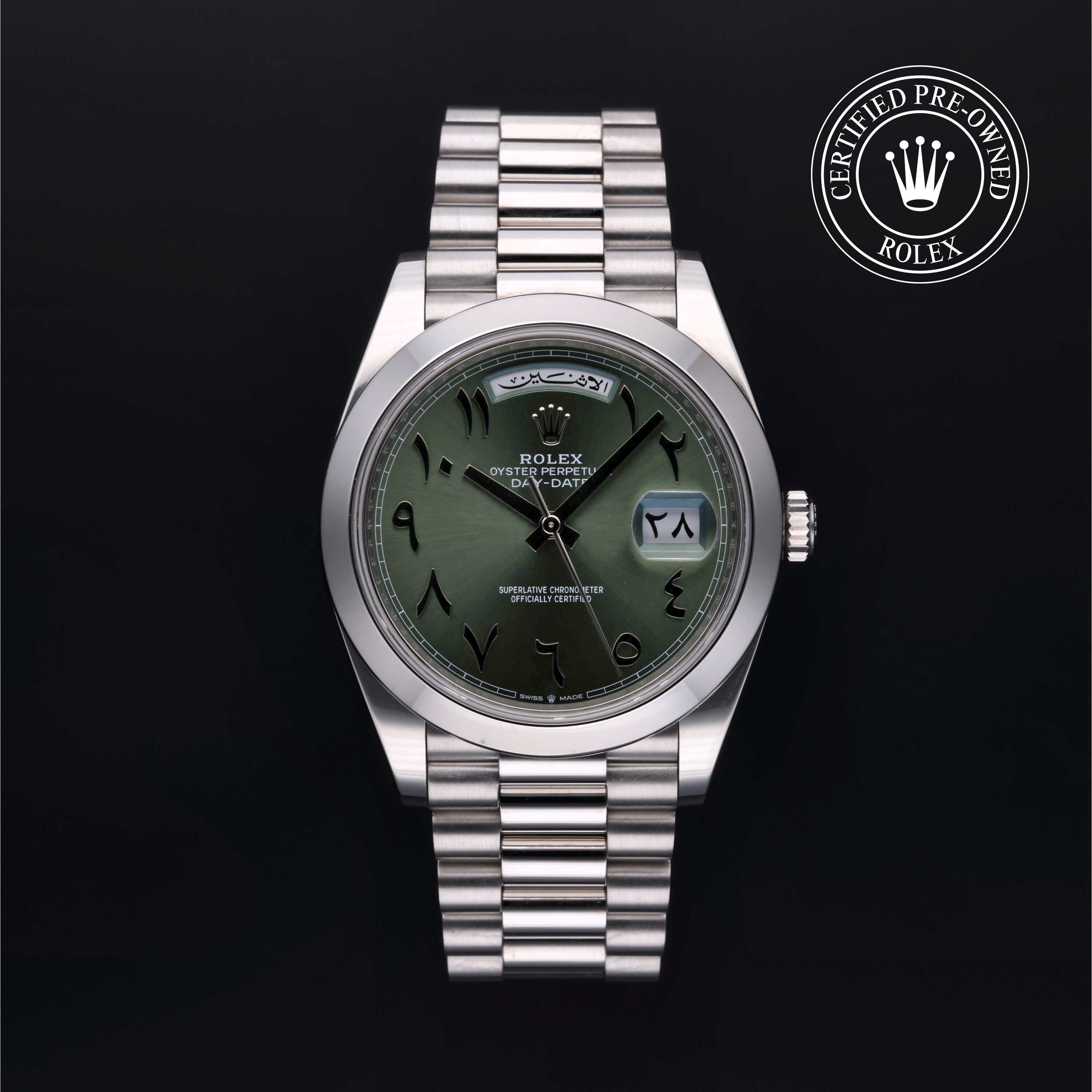 This Rolex Certified Pre-Owned Day-Date with a platinum 40 mm case and a green dial exemplifies Rolex's craftsmanship and genius.